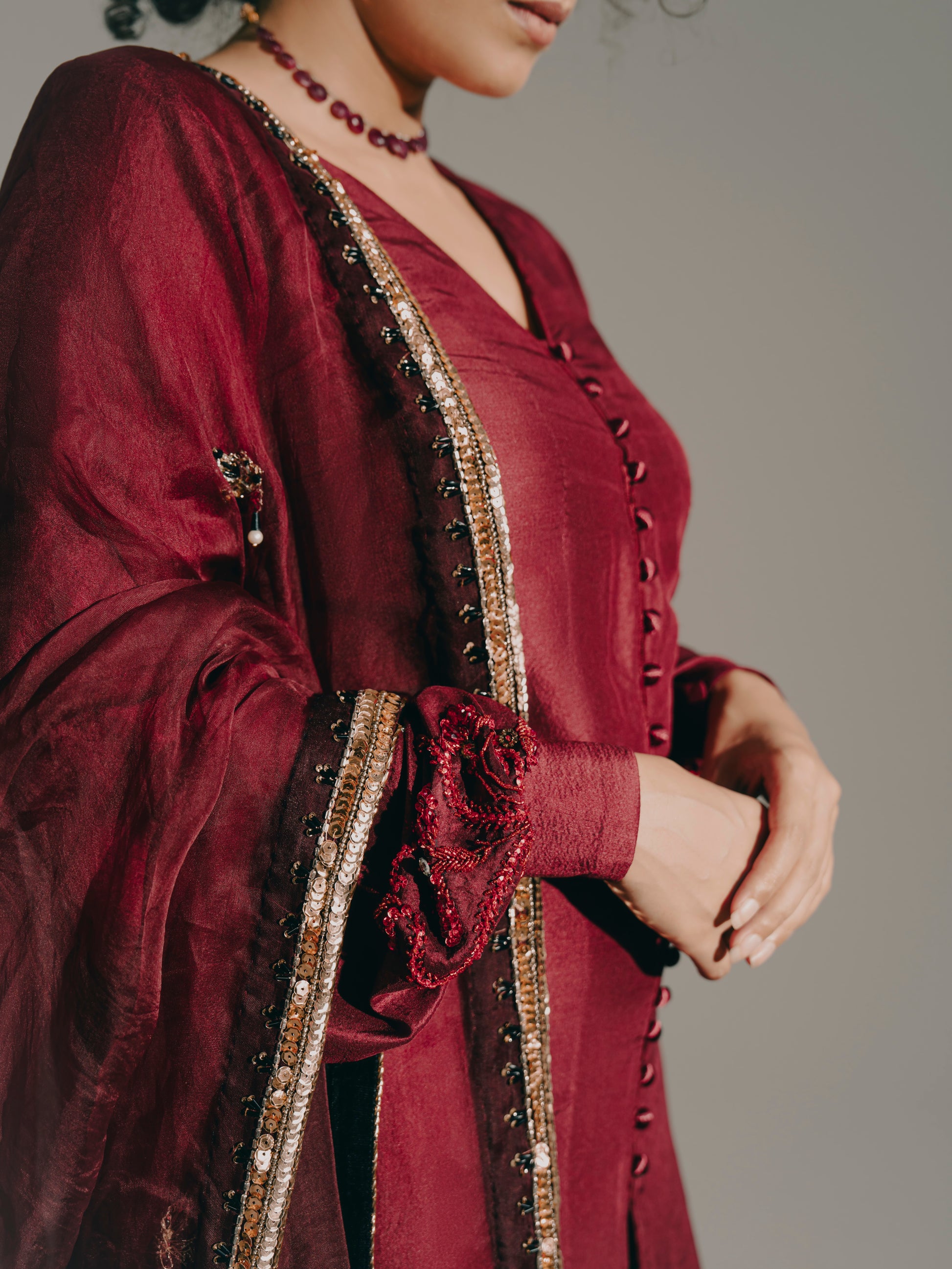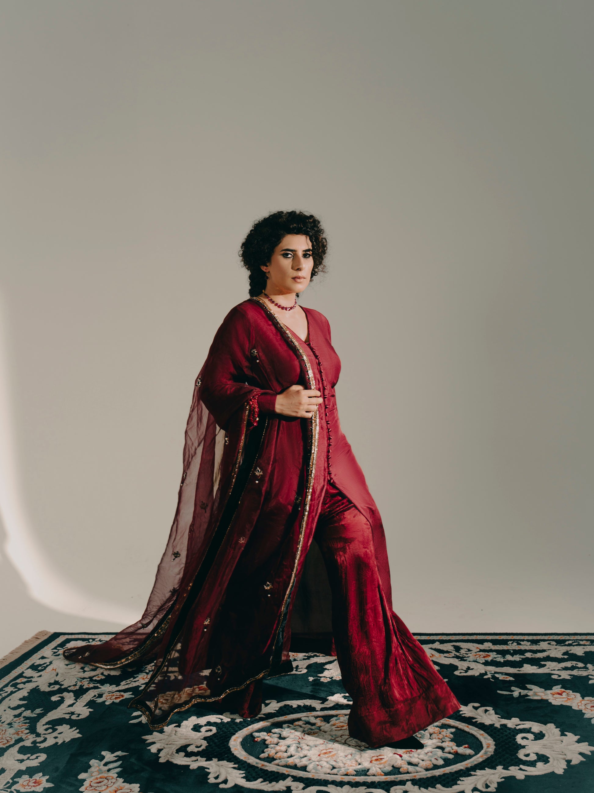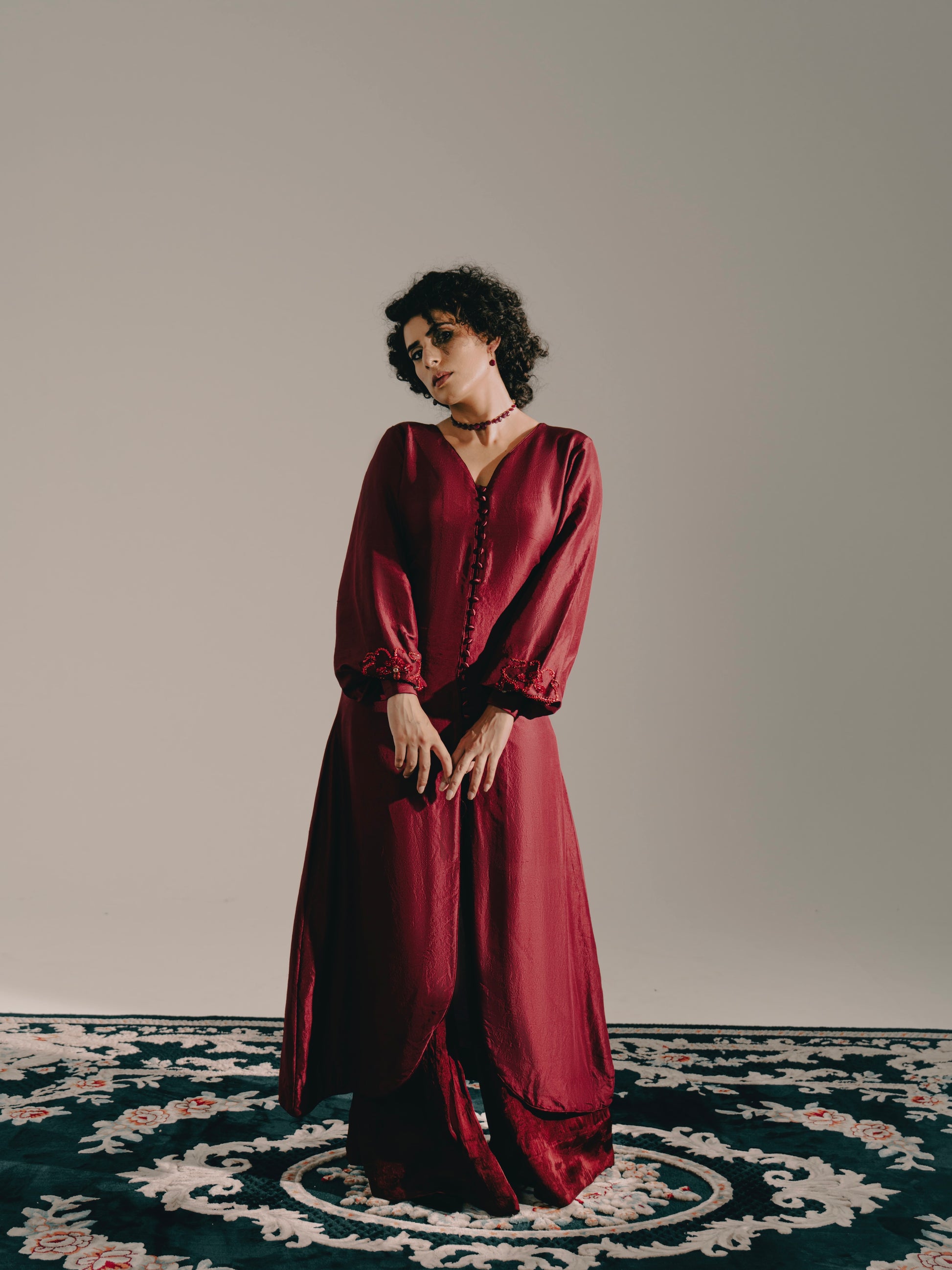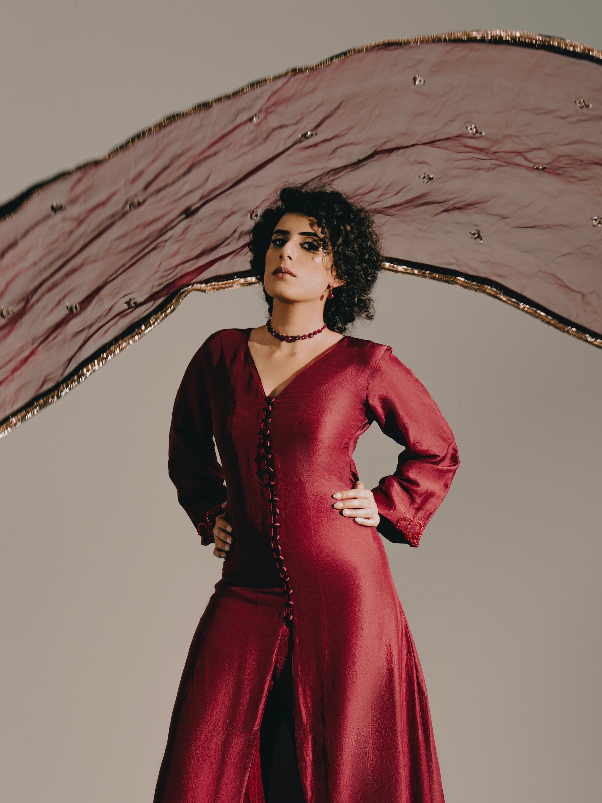 A symbol of unity and passion, this wine-red silhouette embraces both strength and softness, the essence of reunion itself